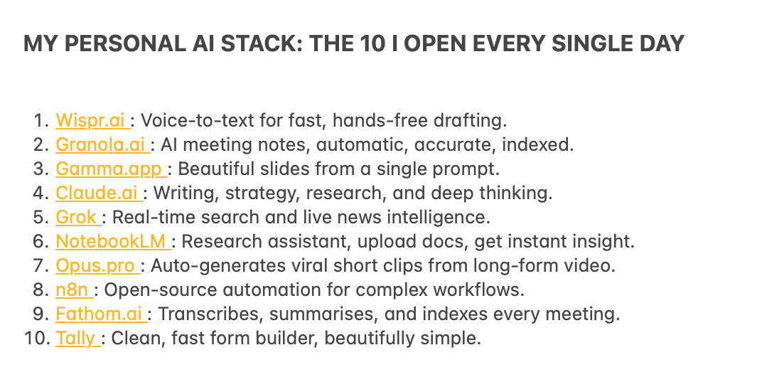 Not what I'd recommend in theory, but what is genuinely open on my screen every single day, and what I've tested, kept, or quietly deleted within a week. The ones below stayed because they actually work for a lean, fast-moving founder operating without a large team behind them.